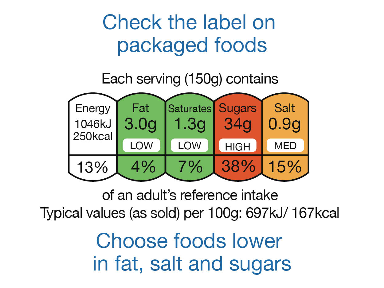 Limiting salt to 6g (1 teaspoon) each day can also help to keep your blood pressure healthy. Look for the traffic-light colours on food packaging to limit foods that are high (red) in salt, sugar, and fat – these are sometimes called ‘ultra-processed’ foods and are not good for our health.