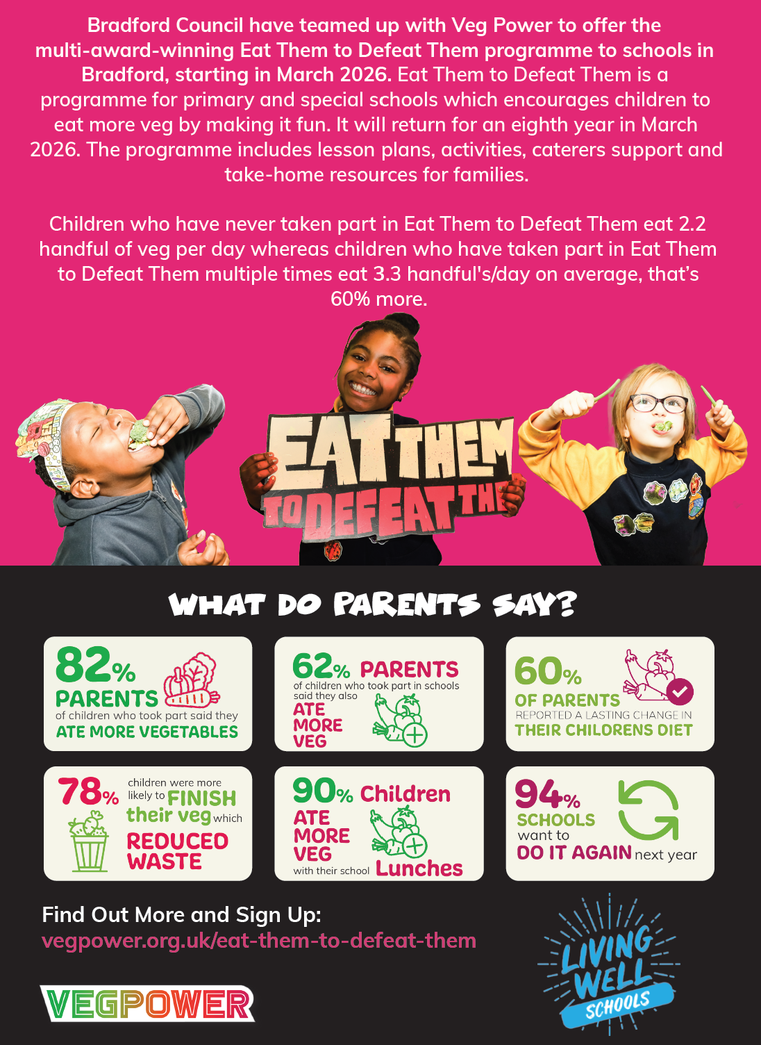 Bradford Council public health have teamed up with Veg Power to offer the multi-award-winning Eat Them to Defeat Them programme to schools in Bradford, starting in March 2026.