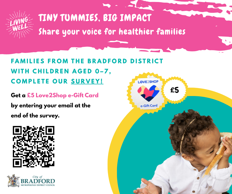 This survey is part of a wider engagement programme that will inform Bradford’s Districts new Infant and Early Years Feeding Strategy. Families’ insights will help us better understand the experiences and perspectives of families across the district, and ensure the strategy reflects the needs of our communities.