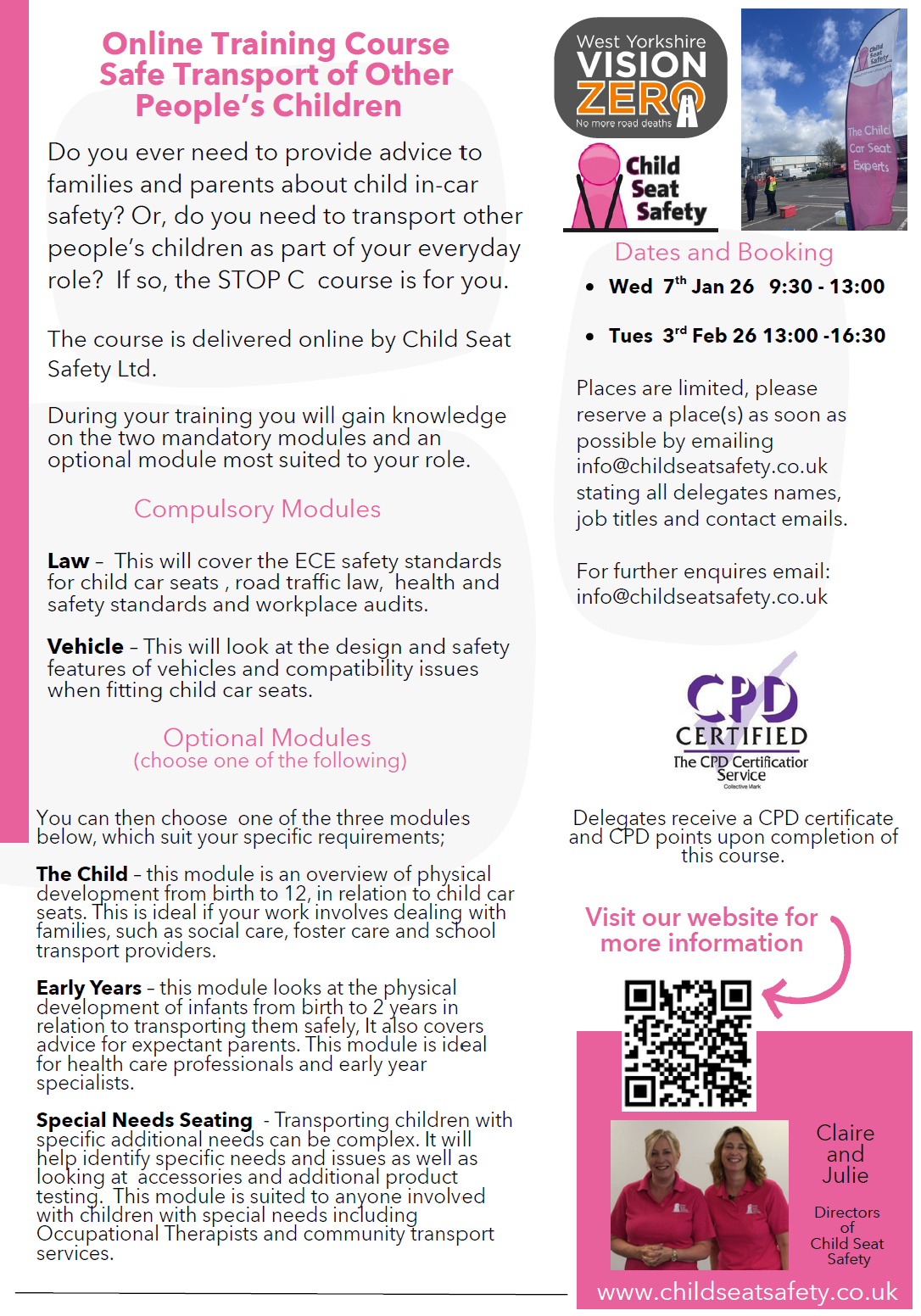 About the training: Offered by the  Vision Zero partnership, this CPD-certified, 3.5-hour online course will help you understand child seat law and safe fitting practices. It is aimed at professionals in West Yorkshire who transport children or advise families.
